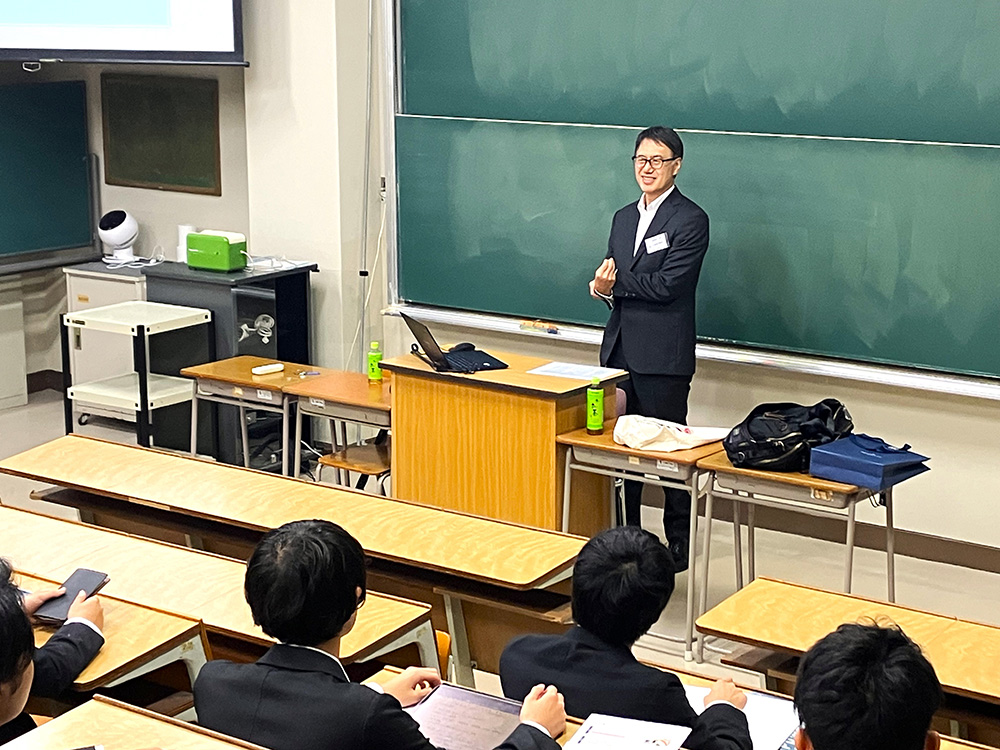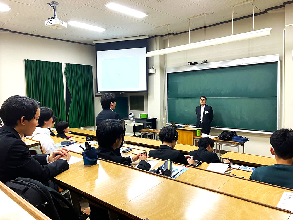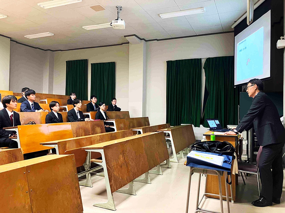 海洋工学部 吉岡教授との協業により実現したもので、これから就職活動を迎える1年生から3年生へ、外航海運の概要と特長、魅力を伝えるために、浦上弊社社長、足立 取締役(技術部門担当役員)のほか、弊社海上職員と内定者が登壇し、講義と質疑応答を行いました。